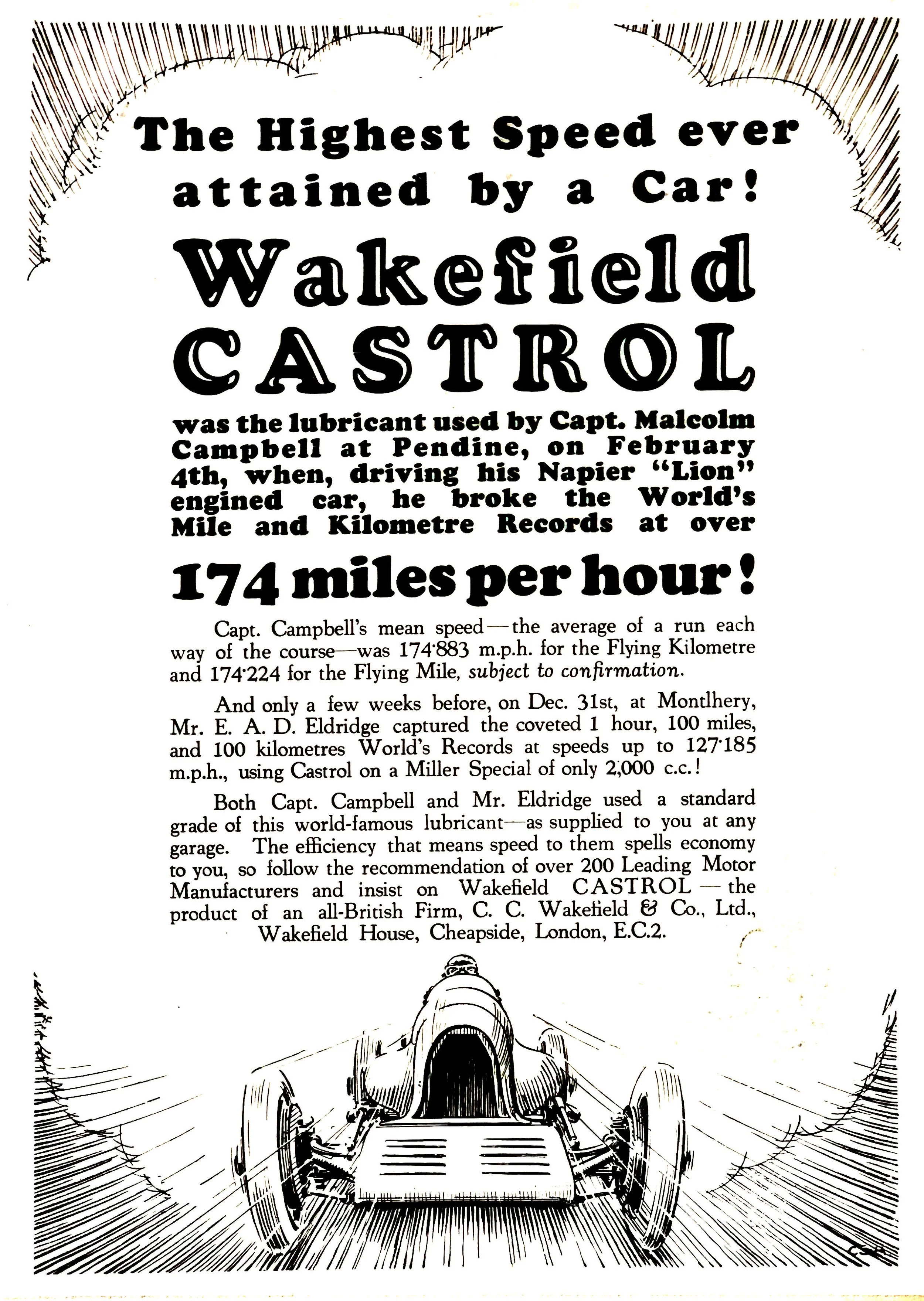 George Eyston often appeared in Castrol advertisements. An example from 1933 announced that on 27 October he posted 104mph at Brooklands in his streamlined car, designed by E. A. Eldridge on a Chrysler chassis and powered by a diesel engine taken from an AEC bus. Castrol provided the oil, and proudly announced the achievement.